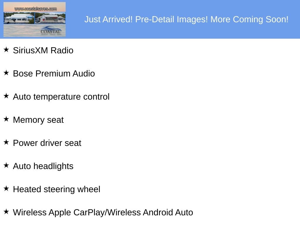 Auto headlights, Auto temperature control, Bose Premium Audio, Heated steering wheel, Memory seat, Power driver seat, SiriusXM Radio, Wireless Apple CarPlay/Wireless Android Auto.