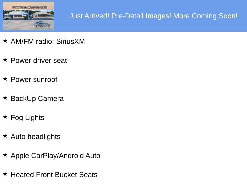 Black Leather, 17" Alloy Wheels, AM/FM radio: SiriusXM, Apple CarPlay/Android Auto, Auto headlights, BackUp Camera, Fog Lights, Heated Front Bucket Seats, Leather Seats, Power driver seat, Power sunroof.